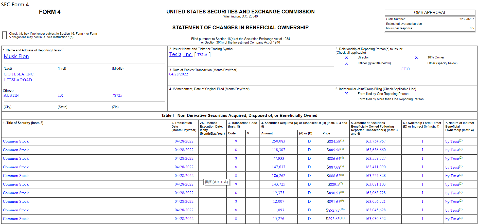 据美国SEC此前文件,这位特斯拉首席执行官在周二和周三共计出售了440多万股股票,每股成交价格在870至1000美元之间,总价值约40亿美元。