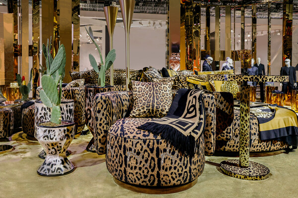 进博“老朋友”杜嘉班纳以品牌经典色金色为灵感进行展台设计,展台由金色镜面结构分割为不同主题展区,多维呈现品牌产品品类,包括时装-成衣与配饰系列、腕表与珠宝系列,以及设计与美妆系列。其中Devotion美妆系列包含女士香氛以及多款彩妆产品,杜嘉班纳家居系列(Dolce&Gabbana Casa)陈列于展台中央,涵盖家具及丰富家居配饰,分为豹纹与欧罗奢金两大主题,此次也是美妆系列与家居系列首次于中国展出。2023/24秋冬男女成衣系列亦陈列于展台一侧,进一步提升展陈的丰富度。