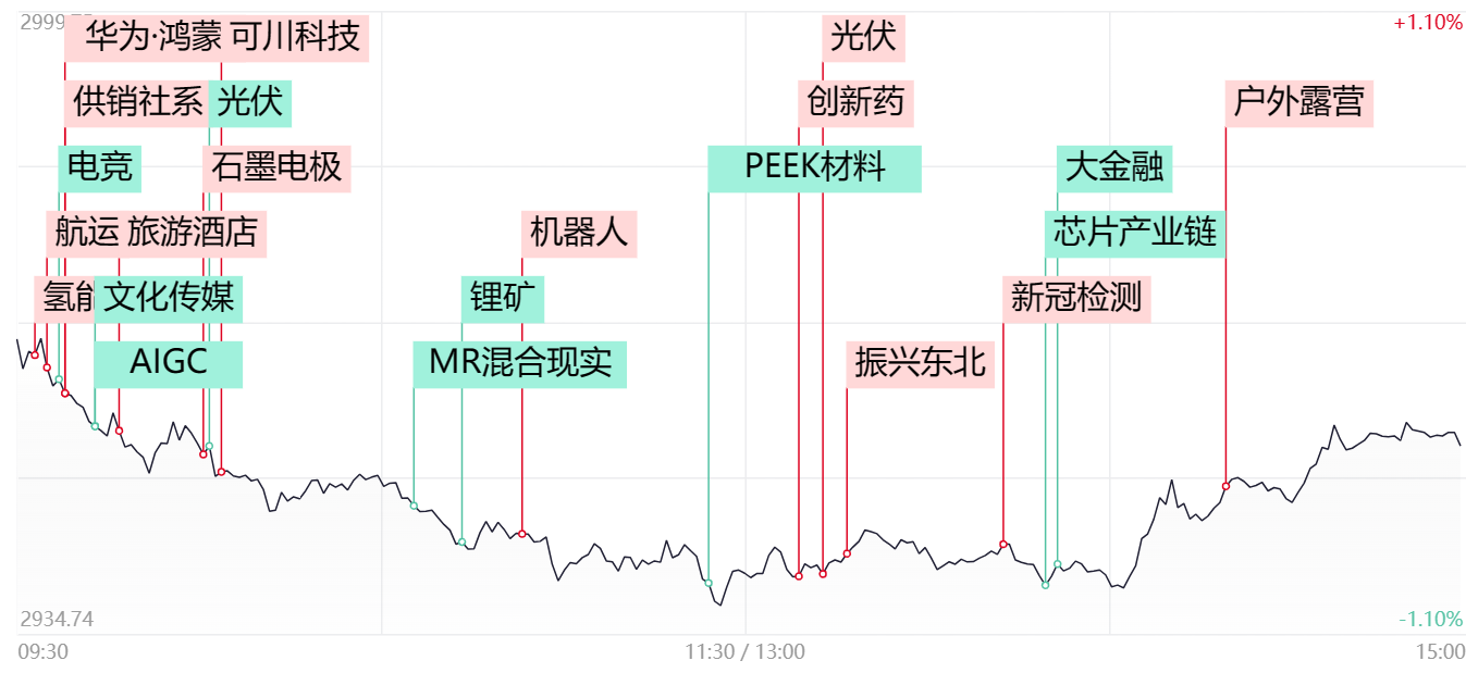 财联社1月4日讯,大盘全天震荡分化,沪指午后有所回升,创业板指领跌。指数黄白分时线走势分化,题材股相对活跃。盘面上,旅游、冰雪产业概念股逆势大涨,长白山、大连圣亚、三夫户外等涨停。鸿蒙概念股盘中活跃,东方中科、智微智能、吉大正元等涨停。供销社概念股开盘走高,浙农股份、天鹅股份涨停。下跌方面,MR概念股持续调整,易天股份跌近10%。总体上个股跌多涨少,全市场3200只个股下跌。沪深两市今日成交额6734亿,较上个交易日缩量641亿。