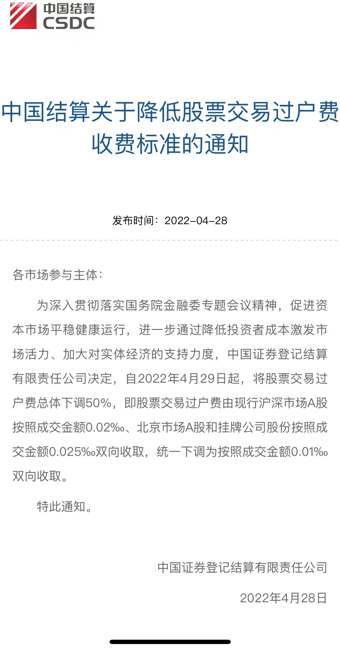 财联社4月28日电,中国证券登记结算有限责任公司发布通知,4月29日起,将股票交易过户费总体下调50%,即股票交易过户费由现行沪深市场A股按照成交金额0.02‰、北京市场A股和挂牌公司股份按照成交金额0.025‰双向收取,统一下调为按照成交金额0.01‰双向收取。