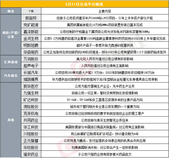 财联社5月11日电,大盘全天冲高回落,整体仍延续反弹之势,创业板指领涨。盘面上,赛道股全天活跃,芯片、锂电池等板块大涨,个股掀涨停潮。高位股尾盘纷纷炸板下挫,两市炸板率近50%。总体上个股跌多涨少,两市超2400只个股下跌。沪深两市今日成交额10781亿,较上个交易日放量2312亿,两市成交额时隔近2个月再度突破1万亿元。上市公司在互动平台积极回应:新宙邦表示,控股子公司投资建设年产2400吨LiFSI项目,今年上半年投产部分产能;兖矿能源表示,集团所属榆林能化10万吨DMMn项目装置安装已基本完成;华纺股份表示,如果美国取消关税,对公司会产生一定积极影响;长城汽车表示,公司坦克300单月最大产能1.5万台,2022年的销量目标依旧维持190万台。