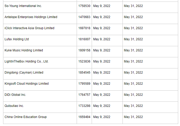 财联社5月12日电,根据美国证券交易委员会(SEC)官网,近日其又将包括11家中概股加入“预摘牌”名单。具体名单为:新氧、Antelope Enterprise、爱点击、陆金所控股、库客音乐、兰亭集势、叮咚买菜、金山云、滴滴、趣头条和51Talk。以上公司需要于5月31日前向SEC提供证据,证明自己不具备被摘牌的条件。若无法证明,则会被列入“确定摘牌名单”。