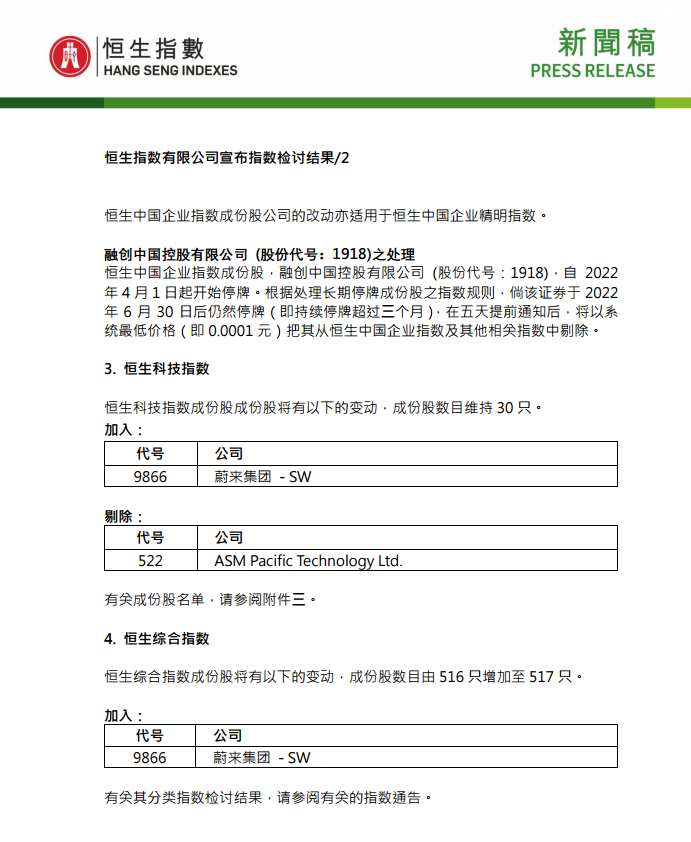 恒指公司:将中芯国际等4家公司纳入恒生指数 蔚来纳入恒生科技指数