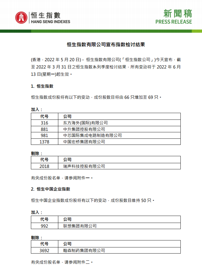 财联社5月20日电,恒指公司公布季检结果,将中芯国际等4家公司纳入恒生指数,剔除瑞声科技,成份股数目将由66只增加至69只;将蔚来集团纳入恒生科技指数,剔除ASM Pacific,成份股数目维持30只。阿里巴巴在恒指中的权重下调至6.48%,腾讯控股、美团的权重分别上调至8.00%和6.71%。中芯国际在恒指中的权重为0.60%。蔚来集团在恒生科技指数中的权重为0.52%。