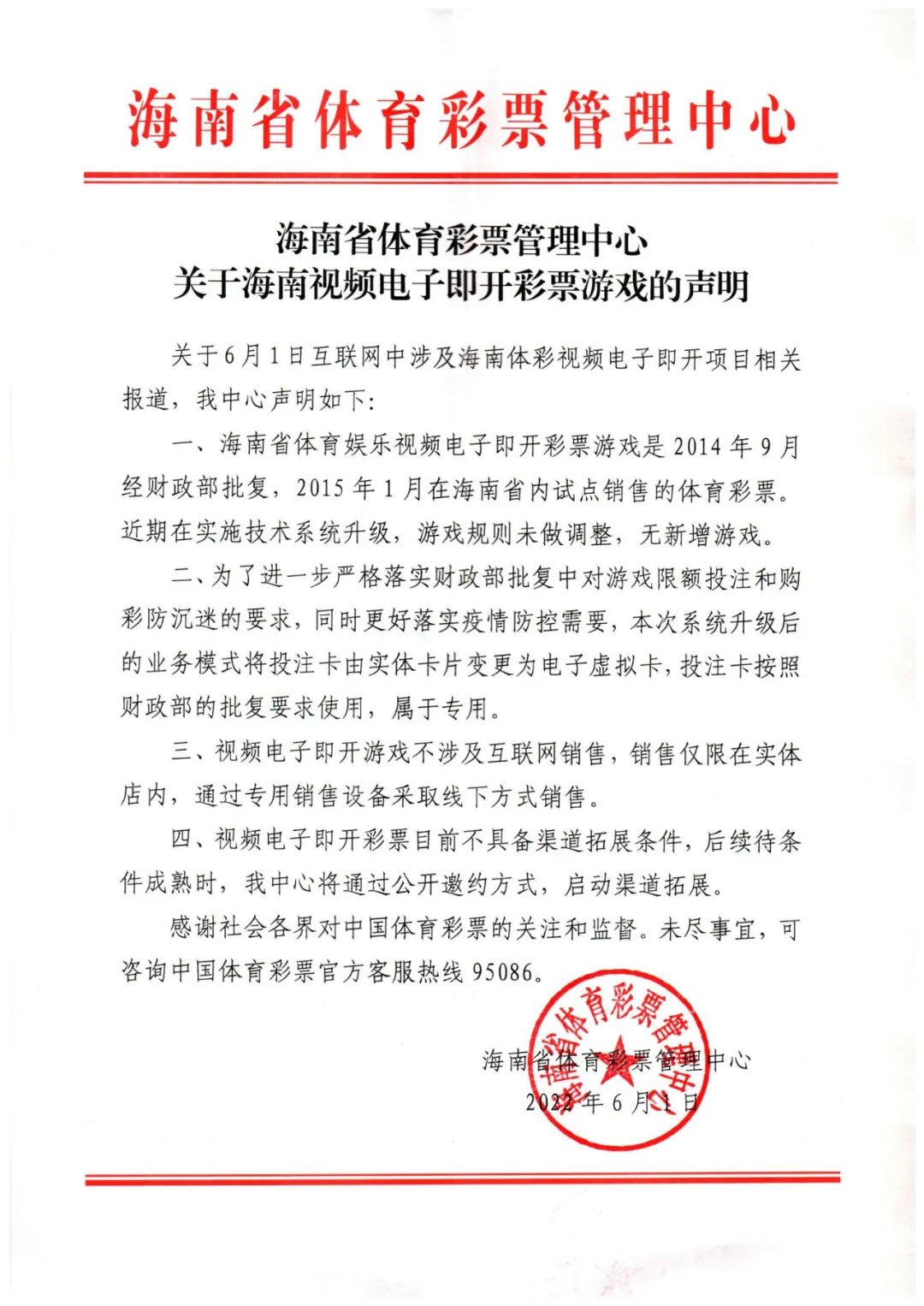财联社6月1日电,关于6月1日互联网中涉及海南体彩视频电子即开项目相关报道,海南省体育彩票管理中心发布声明称,海南省体育娱乐视频电子即开彩票游戏是2014年9月经财政部批复,2015年1月在海南省内试点销售的体育彩票。近期在实施技术系统升级,游戏规则未做调整,无新增游戏。为了进一步严格落实财政部批复中对游戏限额投注和购彩防沉迷的要求,同时更好落实疫情防控需要,本次系统升级后的业务模式将投注卡由实体卡片变更为电子虚拟卡,投注卡按照财政部的批复要求使用,属于专用。视频电子即开游戏不涉及互联网销售,销售仅限在实体店内,通过专用销售设备采取线下方式销售。视频电子即开彩票目前不具备渠道拓展条件,后续待条件成熟时,我中心将通过公开邀约方式,启动渠道拓展。