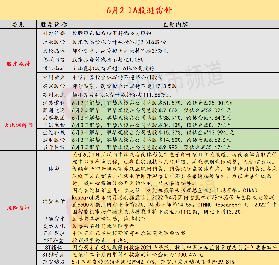 昨日A股拟减持规模较之前有所增多,引力传媒控股股东拟减持不超4%公司股份,乐歌股份股东及高管拟合计减持不超2.28%股份;因赛集团、江苏雷利将迎来超三成以上解禁;富时中国A50指数剔除智飞生物、格力电器、中国石油;中通客车股票交易异常波动,停牌核查;海南省体彩回应视频即开彩票上市,视频电子即开游戏不涉及互联网销售,销售仅限在实体店内;美盛文化股票被实行其他风险警示;美股三大指数集体收跌,热门中概股多数走低。