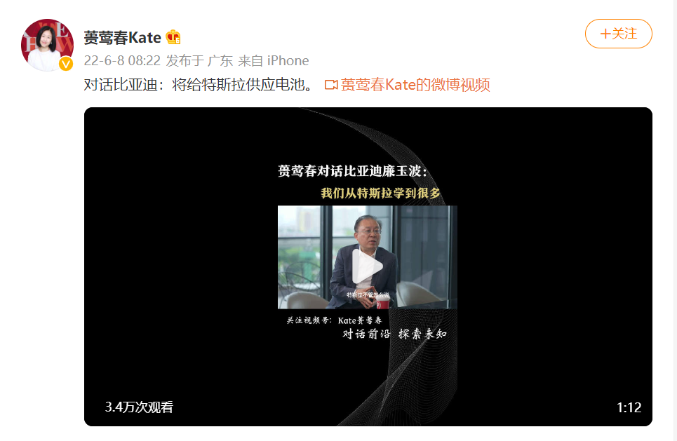 比亚迪高管接受资深媒体人采访时表示:将为特斯拉供应电池