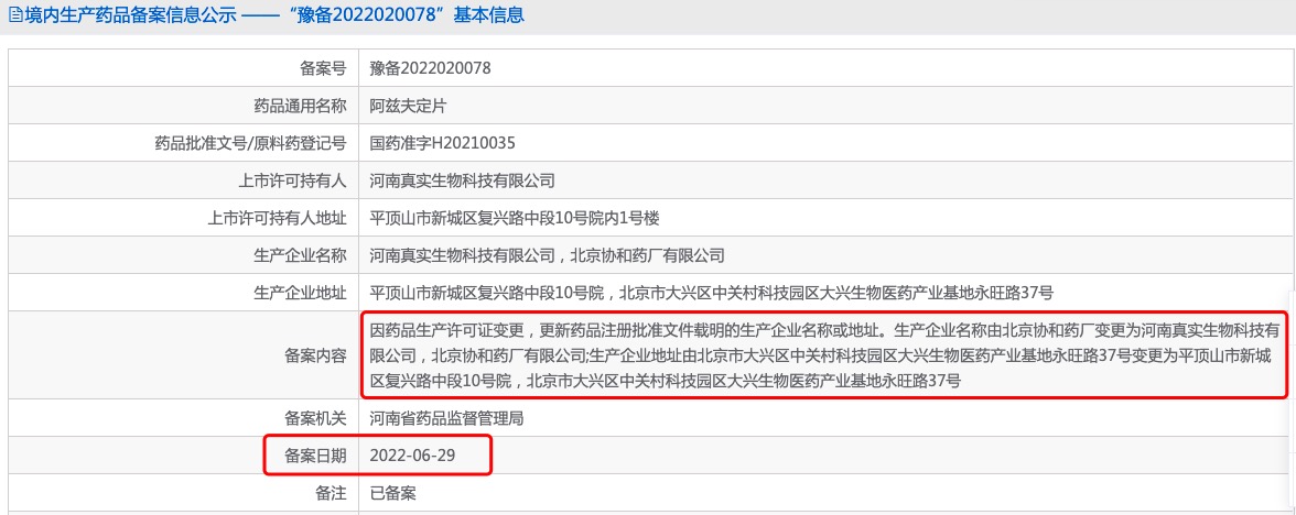 《科创板日报》30日讯,国家药品监督管理局官网信息显示,国产小分子新冠候选药物阿兹夫定对《药品生产许可证》进行了变更,其生产厂家由原来的北京协和药厂,变更为河南真实生物科技有限公司、北京协和药厂有限公司两家,同时,生产地址也进行了相应的变更。29日,该变更信息“已备案”。这意味着,真实生物既可委托其他药企生产阿兹夫定,也已经具备了自行生产阿兹夫定的资质。此前,华润双鹤、奥翔药业、新华制药这三家企业都曾公告称,企业可通过委托生产的方式生产阿兹夫定。(记者 金小莫)