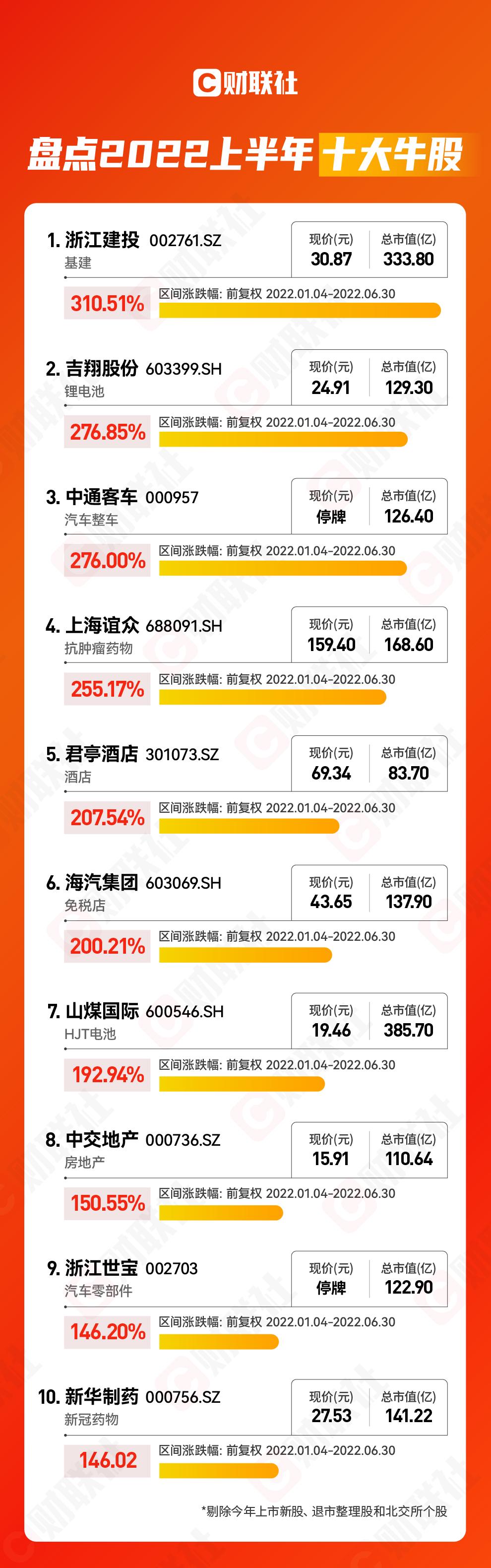 财联社6月30日电,2022年上半A股收官,十大牛股(剔除今年上市新股)出炉,浙江建投上半年上涨310%夺2022年上半年涨幅榜魁首,吉翔股份、中通客车涨幅分居二三位。此外上海谊众、君亭酒店、海汽集团均涨超2倍。十大牛股中共4只新能源概念股入围,此外两只医药股也跻身十大牛股之列。