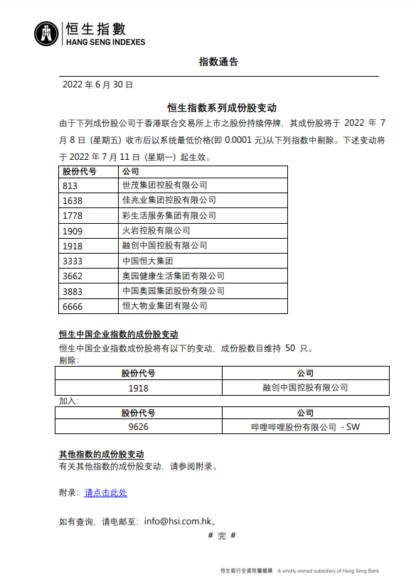 财联社6月30日电,恒生中国企业指数剔除融创中国,加入哔哩哔哩;恒生综合指数剔除世茂集团、佳兆业集团、融创中国、中国恒大、中国奥园和恒大物业。