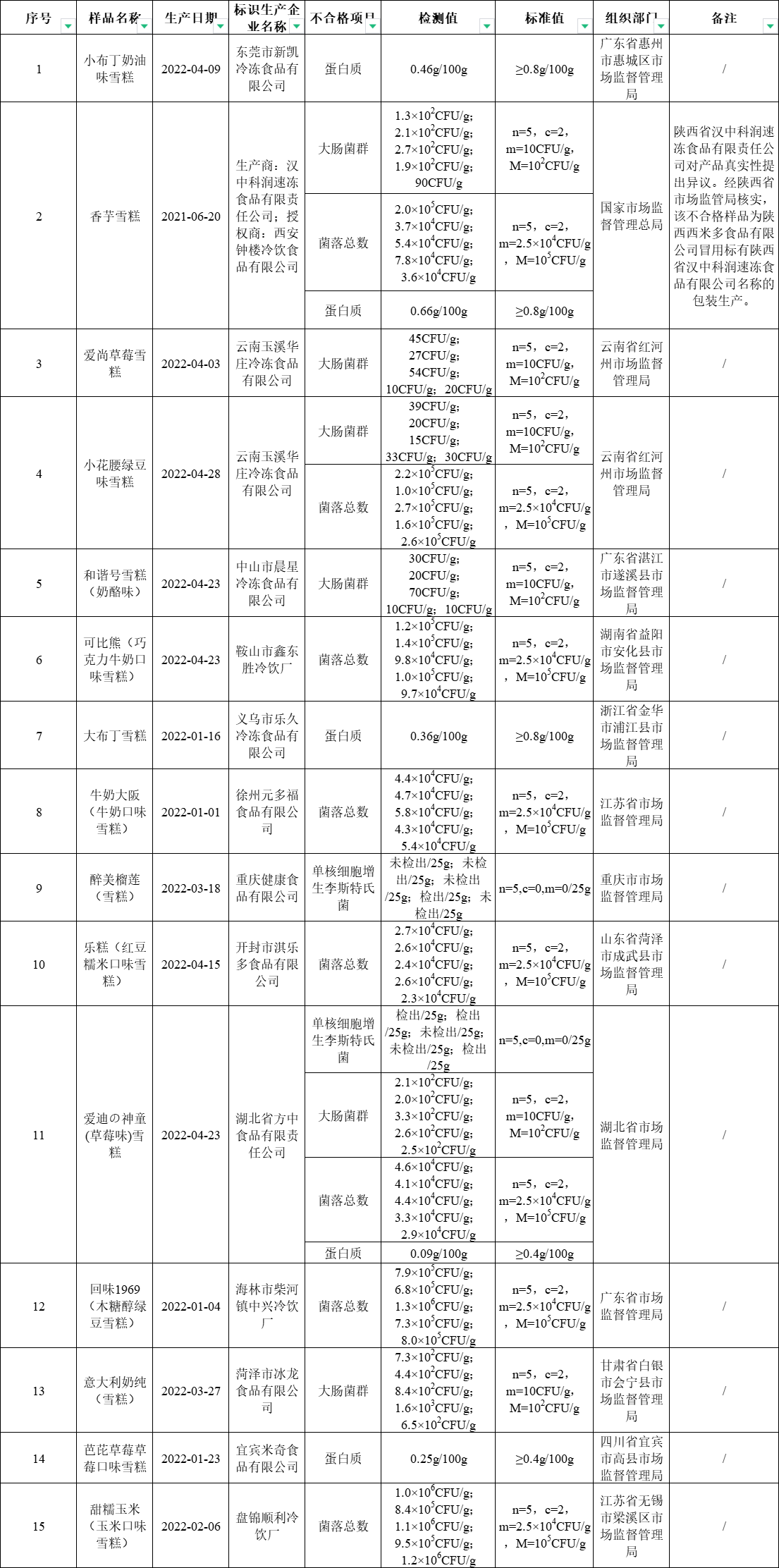 财联社7月16日电,市场监管总局今天发布消息,入夏以来,市场监管总局要求各地市场监管部门加强对雪糕等冷冻饮品的监管,进一步加大对雪糕生产经营企业的监督检查和雪糕产品的监督抽检力度。据初步统计,2022年上半年,各级市场监管部门共组织监督抽检3137批次雪糕产品,检验项目包括蛋白质、甜蜜素、糖精钠、阿斯巴甜、菌落总数、大肠菌群、沙门氏菌、单增李斯特菌等。其中,检出不合格样品15批次,不合格项目为菌落总数、大肠菌群、单增李斯特菌和蛋白质。抽检不合格的主要原因,是生产加工过程卫生条件控制不到位,或者产品在运输、贮存、销售环节不规范操作引起的微生物污染。对发现问题的企业和不合格产品,属地市场监管部门均已依法处置。市场监管总局要求各地市场监管部门持续加强对雪糕等冷冻饮品生产经营企业的监督检查和产品监督抽检,严厉查处违法违规行为,保障雪糕等冷冻饮品质量安全。