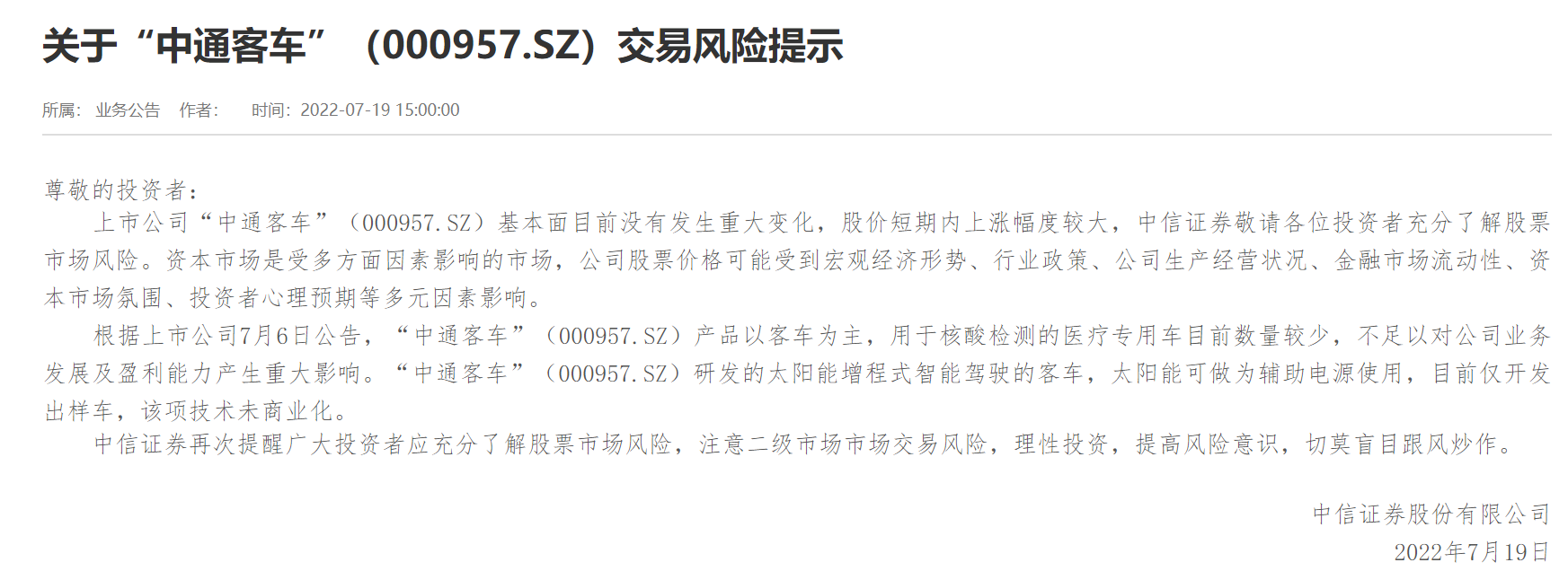 财联社7月19日电,中信证券在官网发布关于“中通客车”交易风险提示。提示称,上市公司“中通客车”基本面目前没有发生重大变化,股价短期内上涨幅度较大,中信证券敬请各位投资者充分了解股票市场风险。资本市场是受多方面因素影响的市场,公司股票价格可能受到宏观经济形势、行业政策、公司生产经营状况、金融市场流动性、资本市场氛围、投资者心理预期等多元因素影响。根据上市公司7月6日公告,“中通客车”产品以客车为主,用于核酸检测的医疗专用车目前数量较少,不足以对公司业务发展及盈利能力产生重大影响。“中通客车”研发的太阳能增程式智能驾驶的客车,太阳能可做为辅助电源使用,目前仅开发出样车,该项技术未商业化。中信证券再次提醒广大投资者应充分了解股票市场风险,注意二级市场市场交易风险,理性投资,提高风险意识,切莫盲目跟风炒作。