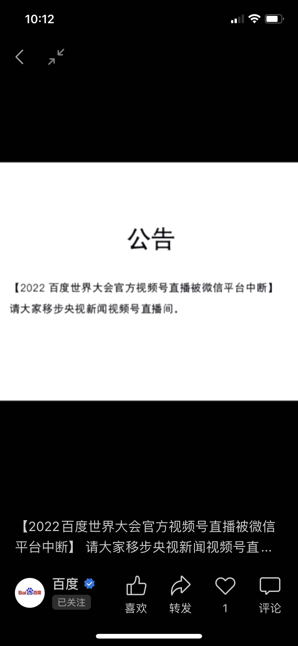 百度:2022百度世界大会官方视频号直播被微信平台中断