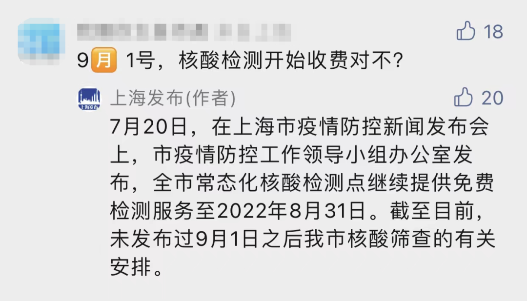 财联社7月26日电,有网友向上海发布询问:9月1号,核酸检测开始要收费了对不?对此,上海发布回应称:7月20日,在上海市疫情防控新闻发布会上,市疫情防控工作领导小组办公室发布,全市常态化核酸检测点继续提供免费检测服务至2022年8月31日。截至目前,未发布过9月1日之后我市核酸筛查的有关安排。