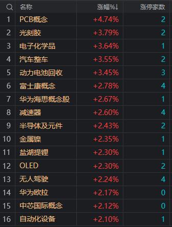 财联社8月1日电,大盘全天探底回升,三大指数走势有所分化,创业板指大涨超2%。盘面上,新能源汽车产业链板块走强,宁德时代涨超5%。机器人概念股持续活跃,板块内个股掀涨停潮。PCB概念股大涨,广信材料20CM涨停。整体上,今日赛道股继续轮动活跃。下跌方面,房地产等蓝筹板块陷入调整。总体上个股涨多跌少,两市超2500只个股上涨,超百股涨停或涨超10%。沪深两市今日成交额9939亿,较上个交易日缩量205亿,成交金额再度跌破万亿。板块方面,PCB概念、光刻胶、汽车整车、盐湖提锂等板块涨幅居前,培育钻石、农业、房地产、公路铁路运输等板块跌幅居前。截止收盘,沪指涨0.21%,深成指涨1.2%,创业板指涨2.37%。北向资金全天净买入23.98亿元;其中沪股通净买入8.93亿元,深股通净买入15.05亿元。