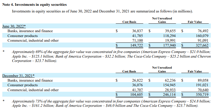 财联社8月6日电,伯克希尔-哈撒韦A(BRK.A.N)Q2营收761.8亿美元,市场预期735.37亿美元,去年同期691.14亿美元。第二季度投资和衍生品净亏损533.8亿美元,第二季度运营利润92.8亿美元,二季度归属于伯克希尔哈撒韦公司股东的净亏损为437.55亿美元,二季度末现金储备为1054亿美元。截至6月30日,公司总投资的公允价值约69%集中在美国运通(210亿美元)、苹果(1251亿美元)、美国银行(322亿美元)、可口可乐公司(252亿美元)和雪佛龙(237亿美元)。