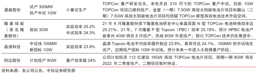 中信证券华鹏伟在7月28日发布的研报中表示,以晶科能源、中来股份为首的电池龙头企业率先布局N型TOPCon产能。据不完全统计,截至2022年5月底市场已投产TOPCon电池产能超24GW,其中晶科能源已投产16GW,中来股份已投产3.5GW。目前行业规划TOPCon产能超80GW,主流厂商如天合光能、晶澳科技、隆基绿能、天合光能、通威股份等均有布局。