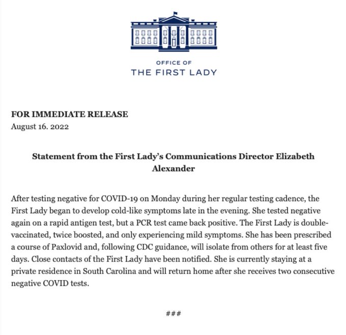 财联社8月16日电,美国第一夫人办公室8月16日发布声明称,美国第一夫人吉尔·拜登新冠病毒检测呈阳性。声明称,吉尔·拜登出现轻微症状,正在服用新冠药物Paxlovid。她将留在位于南卡罗莱纳州的私人住所,将在连续两次检测结果呈阴性后返回华盛顿。声明还称,在美国疾控中心相关指导下,她将隔离至少5天。