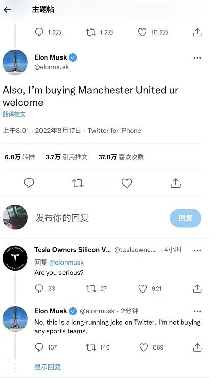 马斯克称“购买曼联”只是玩笑 没有在购买任何体育队伍