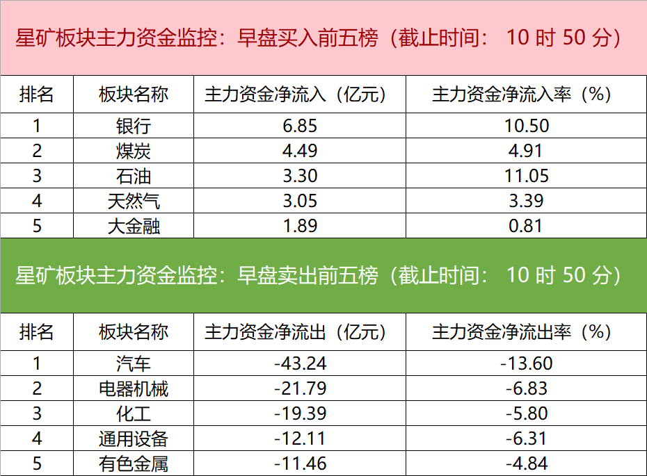 财联社星矿数据显示,今日早盘主力资金净流入银行、煤炭、石油等板块,净流出汽车、电器机械、化工等板块,其中净流出汽车板块超43亿元。个股方面,通威股份上涨,主力资金净买入4.21亿元,高德红外、平安银行、三安光电获主力资金净流入居前;隆基绿能遭净卖出超10亿元,长安汽车、比亚迪、江淮汽车主力资金净流出额居前。