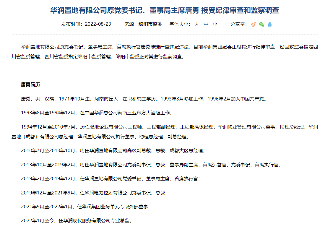 财联社8月23日电,华润置地有限公司原党委书记、董事局主席、首席执行官唐勇涉嫌严重违纪违法,目前华润集团纪委正对其进行纪律审查,经国家监委指定四川省监委管辖,四川省监委指定绵阳市监委管辖,绵阳市监委正对其进行监察调查。