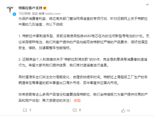 特斯拉中国:目前没有使用任何新型号电池计划 “特斯拉即将改款”消息不实