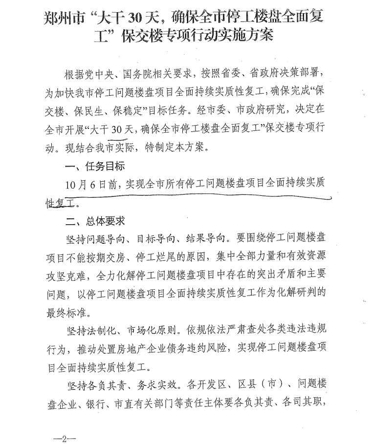 财联社9月7日电,今日一则关于郑州市“大干30天,确保全市停工楼盘全面复工”保交楼专项行动实施方案的通知在网络流传,该文件由“郑州市安置房建设和问题楼盘攻坚化解工作领导小组”印发。文件要求,10月6日前,实现郑州全市所有停工问题楼盘项目全面持续实质性复工。经财联社记者求证,该文件内容属实,目前已传达至部分房企。(财联社记者 陈业)