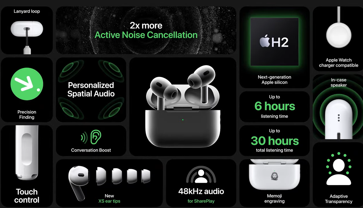 财联社9月8日电,苹果宣布推出新款AirPods Pro,起售价249美元,9月9日起接受预订,9月24日正式上市。新款AirPods Pro配备H2芯片,将提供个性化的空间音频;续航能力可达6小时。