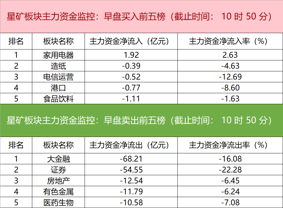 财联社9月16日电,财联社星矿数据显示,今日早盘主力资金仅净流入家用电器板块,净流出大金融、证券、房地产等板块,其中净流出大金融板块超68亿元。个股方面,中国软件涨停,主力资金净买入3.64亿元,海康威视、证通电子、通达股份获主力资金净流入居前;东方财富遭净卖出超26亿元,中信证券、天齐锂业、广发证券主力资金净流出额居前。