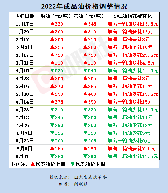 国内成品油价迎年内第七跌 加满一箱油将少花11.5元