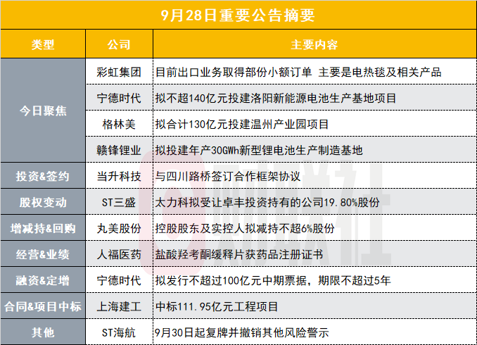 宁德时代公告,拟在河南省洛阳市伊滨区投资建设洛阳新能源电池生产基地项目,项目总投资不超过人民币140亿元。同日公告,拟在全国银行间债券市场注册发行不超过100亿元中期票据。