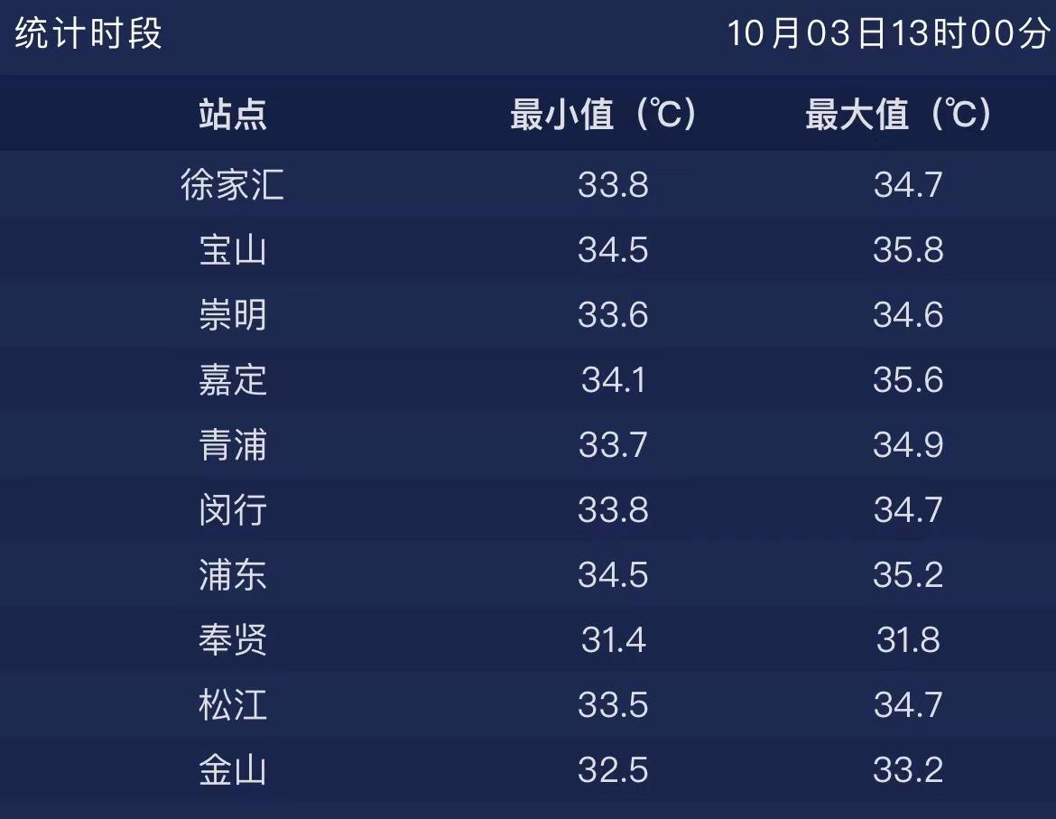 财联社10月3日电,上海中心气象台10月03日13时5分发布高温黄色预警信号:受副热带高压影响,预计上海大部地区今天(10月3日)的最高气温将超过35℃,请做好防暑降温工作。今天13时左右,上海徐家汇站实时气温达34.7℃,已打破上海10月日最高气温纪录。此前,上海徐家汇站10月历史最高气温为1984年10月2日记录的34.0℃。
