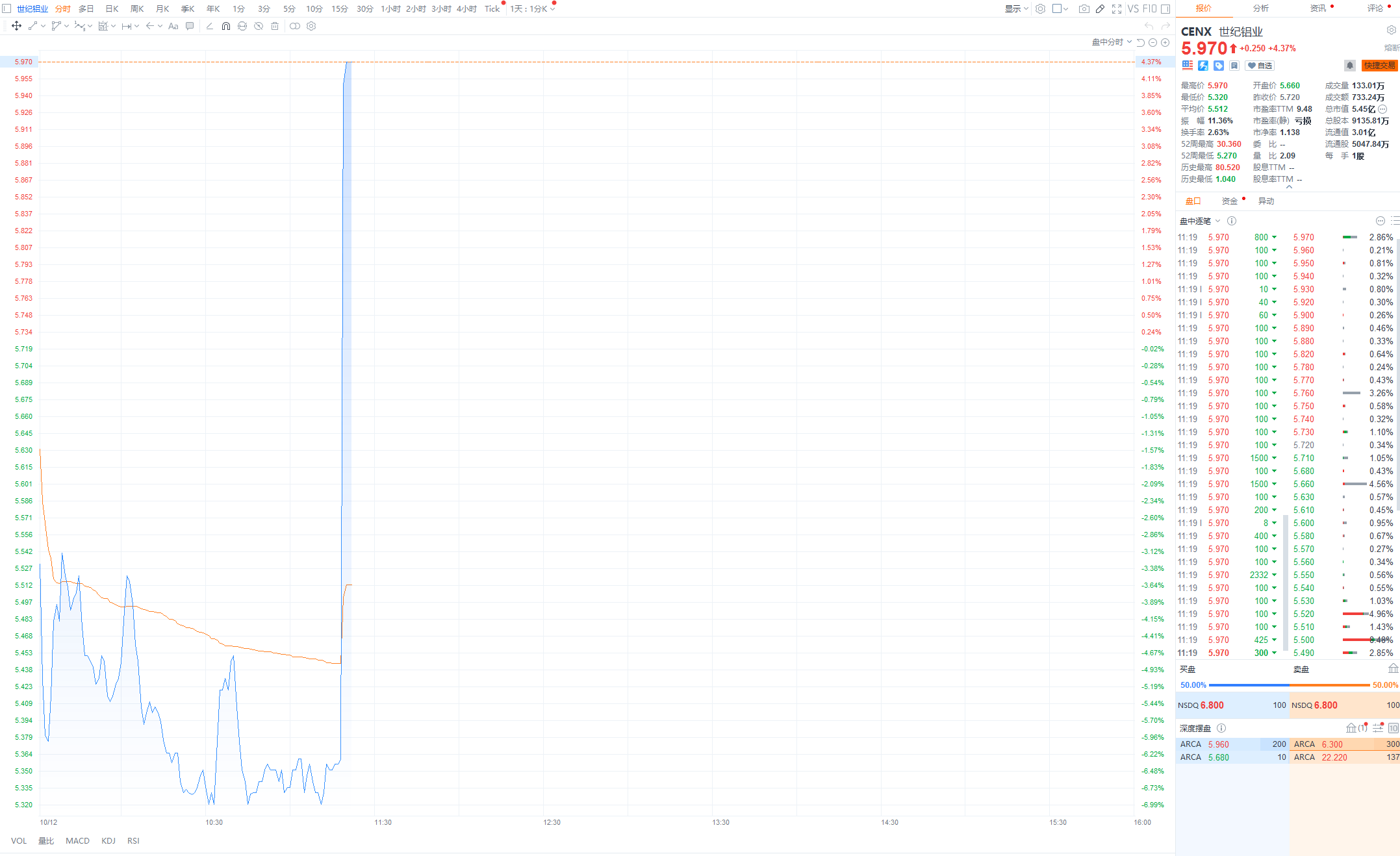 财联社10月12日电,美股世纪铝业向上触发熔断,截至目前,涨幅为4.37%,报5.97美元/股。美国铝业涨超7%。此前,白宫表示,考虑禁止进口俄罗斯铝。