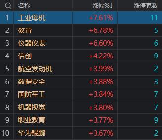 财联社10月17日电,大盘全天低开后震荡走高,三大指数均小幅上涨,沪指日线5连阳。盘面上,工业母机概念股掀涨停潮,华辰装备、华中数控、恒锋工具均20CM涨停。教育股大涨,科德教育20CM涨停,凯文教育、国新文化等涨停。数字经济概念股持续走强,创业板股科创信息3连板,竞业达9天7板,国脉科技6连板。此外,军工、医疗、半导体等板块均表现活跃。下跌方面,赛道股陷入调整,光伏方向领跌。总体上个股涨多跌少,两市近4000只个股上涨,近20股20CM涨停。沪深两市今日成交额8073亿,较上个交易日缩量536亿。板块方面,工业母机、教育、数字经济、军工等板块涨幅居前,燃气、TOPCON电池、一体化压铸、煤炭等板块跌幅居前。截至收盘,沪指涨0.42%,深成指涨0.36%,创业板指涨0.03%。北向资金全天净卖出44.25亿元,其中沪股通净卖出29.76亿元,深股通净卖出14.48亿元。