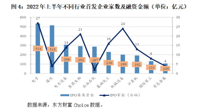 数据统计显示,全行业上半年共服务171家企业实现境内首发上市,融资金额达到3119.20亿元,同比增长45.78%。其中,在科创板首发上市的“硬科技”企业54家,融资1155.56亿元;在创业板首发上市的成长型创新创业企业68家,融资871.17亿元;在北交所首发上市的“专精特新”创新型中小企业19家,融资28.62亿元。