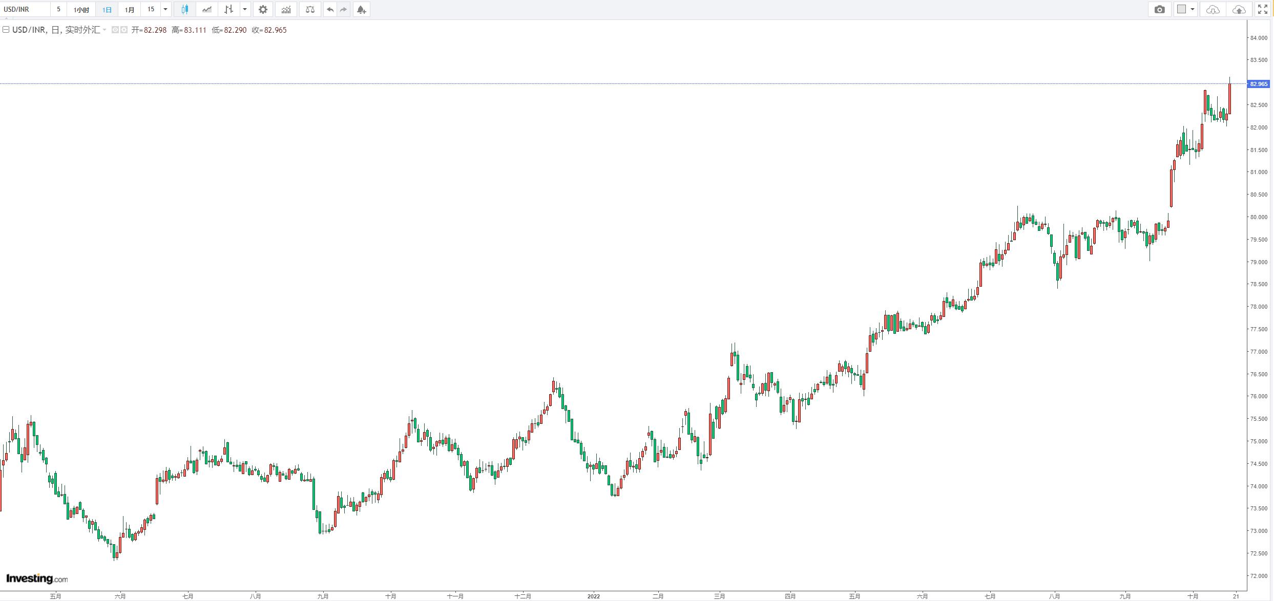 财联社10月19日电,当地时间19日晚印度汇市收盘时,印度卢比对美元汇率首次跌破83:1,创下历史新低。当天,印度卢比对美元收于83.02,首次跌破83关口。印度芬雷克斯财务顾问公司财务主管班萨利表示,印度两家公共部门企业对美元产生了巨大需求,导致当日印度卢比跌至历史最低点。