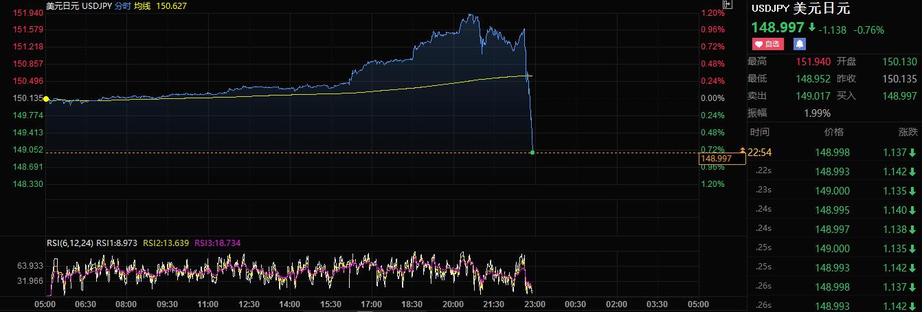 财联社10月21日电,美元兑日元USD/JPY回落至149下方,较日高回落近300点,日内跌0.77%。