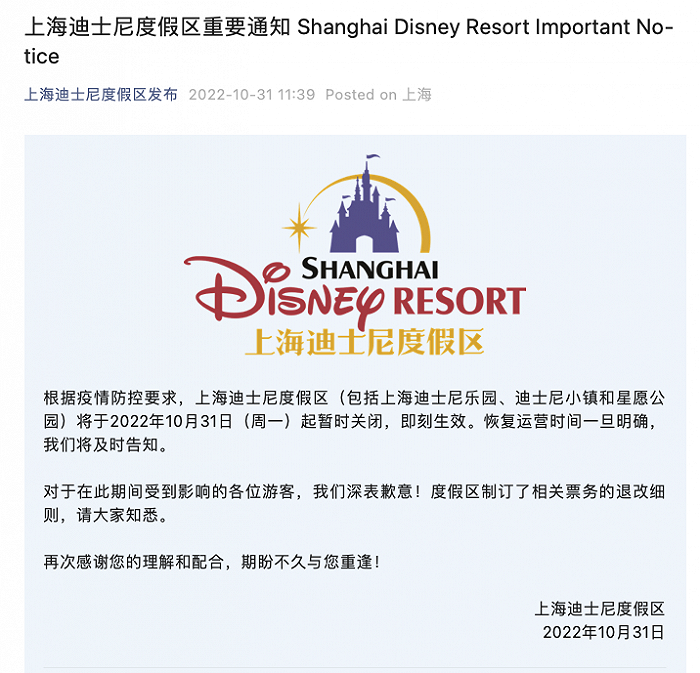 财联社10月31日电,上海迪士尼度假区发布通知:根据疫情防控要求,上海迪士尼度假区(包括上海迪士尼乐园、迪士尼小镇和星愿公园)将于2022年10月31日(周一)起暂时关闭,即刻生效。恢复运营时间一旦明确,将及时告知。
