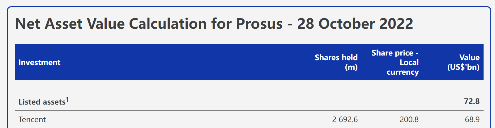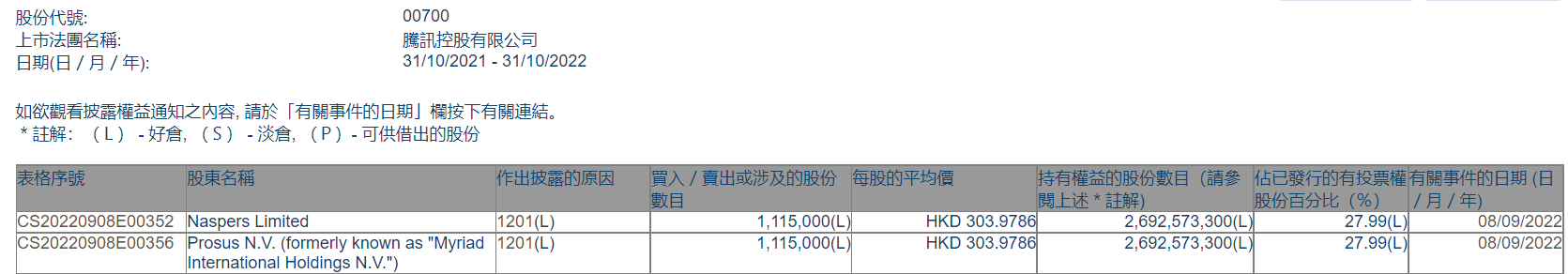 财联社10月31日电,腾讯控股(00700.HK)午后加速上涨,最高一度涨超7%。截至发稿腾讯股价报213港元,涨6%。据腾讯最大股东南非Naspers荷兰子公司Prosus的资产净值报表显示,截至10月28日,Prosus仍持有26.926亿股腾讯股票,与港交所披露文件显示的9月9日Prosus持股数量一致。这意味着Naspers在9月9日至10月28日的一个多月里,阶段性停止减持腾讯股票。