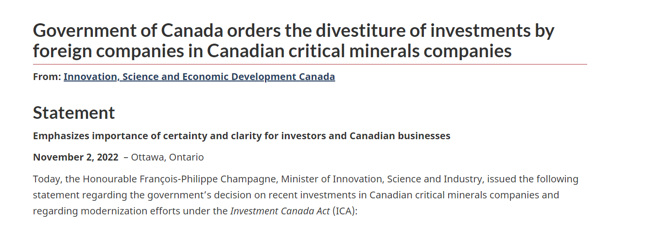 财联社11月3日电,当地时间11月2日,加拿大工业部以所谓国家安全为由,要求三家中国公司剥离其在加拿大关键矿产公司的投资。这三家公司分别是:中矿资源(002738.SZ)旗下中矿(香港)稀有金属资源有限公司、盛新锂能(002240.SZ)香港孙公司盛泽锂业国际有限公司、以及藏格矿业(000408.SZ)旗下子公司Zangge Mining Investment (Chengdu) Co Ltd。上周加拿大政府出台新规称,外国国有企业对加拿大关键矿产企业的投资将面临严格审查。