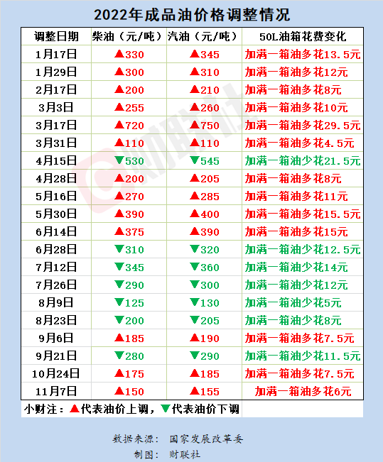 财联社11月7日电,国家发改委发布消息称,自今日24时起,国内汽油价格上调155元/吨,柴油价格上调150元/吨。折合升价,92号汽油价格上调0.12元/升,95号汽油、0号柴油也均上调0.13元/升。以油箱容量50L的普通私家车计算,车主们加满一箱油将多花6元左右;对满载50吨的大型物流运输车辆而言,平均每行驶一百公里,燃油费用增加5.2元左右。