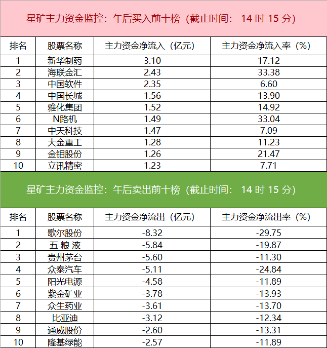 财联社11月8日电,财联社星矿数据显示,今日无主力资金净流入的板块,净流出汽车、大金融、化工等板块,其中净流出汽车板块22.21亿。个股方面,新华制药涨停,主力资金净买入3.10亿,海联金汇、中国软件、中国长城等获主力资金净流入居前;歌尔股份遭净卖出超8亿,五粮液、贵州茅台、众泰汽车等主力资金净流出额居前。