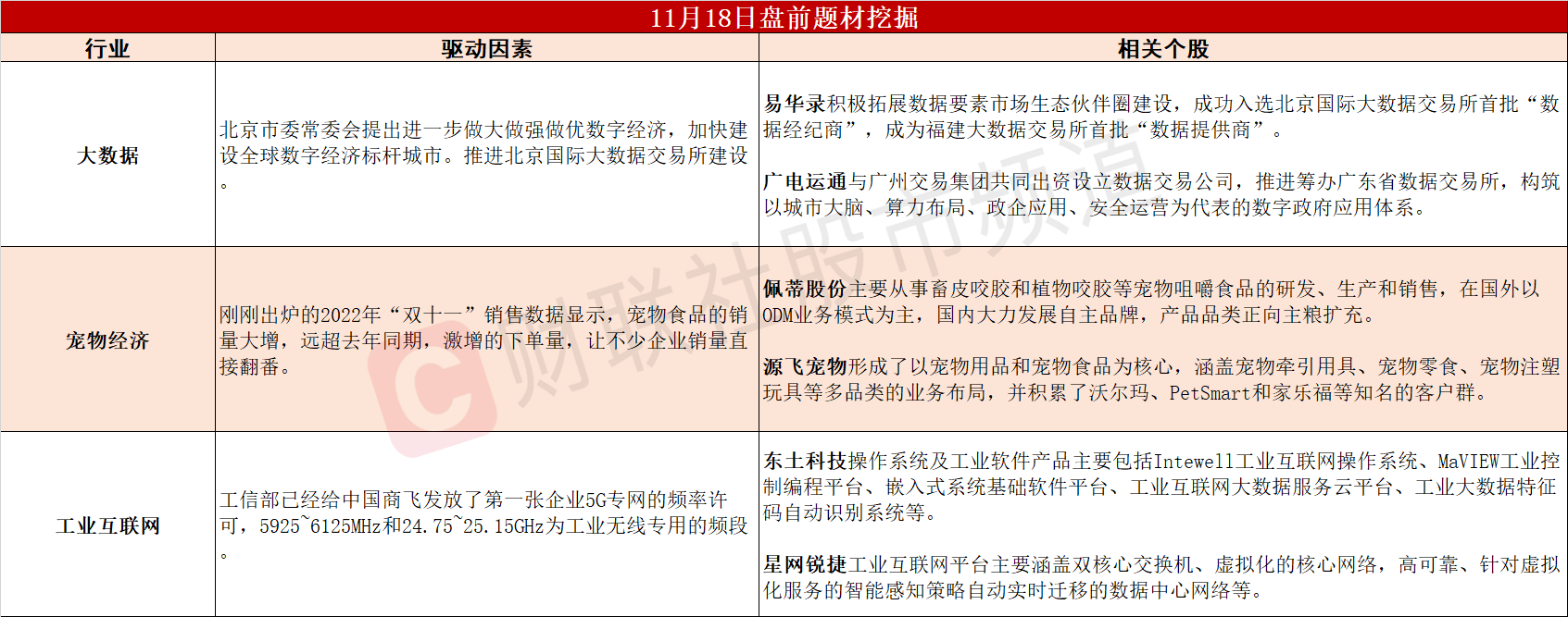 ①北京推进大数据交易所建设,数据服务商成长空间巨大;②“双十一”宠物食品销量大增,国产品牌近年来迅速崛起;③中国商飞获首张企业5G专网频率许可,工业互联网或将加速发展。