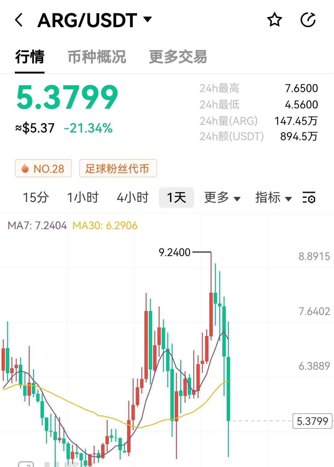 阿根廷足协粉丝代币ARG币大跌逾20%