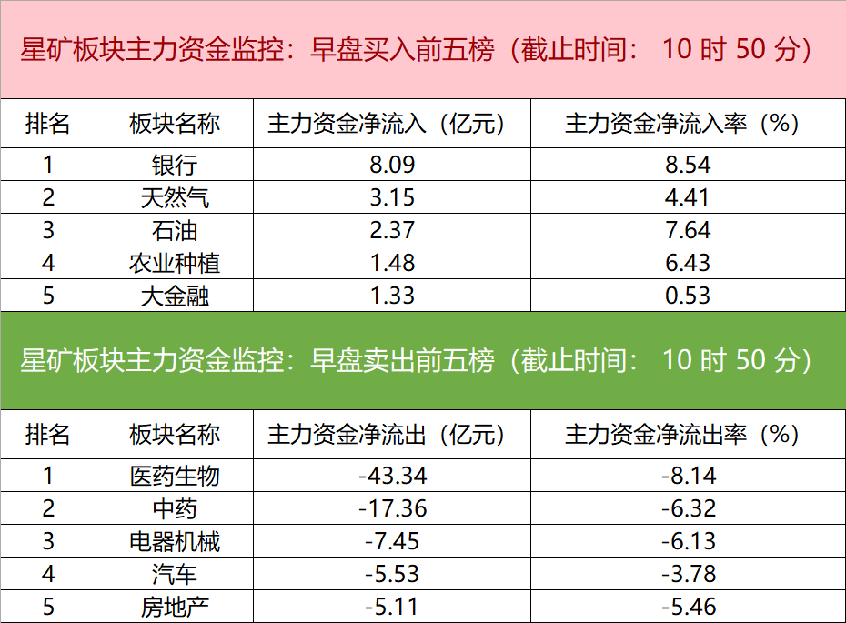财联社11月23日电,财联社星矿数据显示,今日早盘主力资金净流入银行、天然气、石油等板块,净流出医药生物、中药、电器机械等板块,其中净流出医药生物板块超43亿元。个股方面,中国交建涨停,主力资金净买入3.14亿元,永太科技、中国建筑、中国中铁获主力资金净流入居前;众生药业遭净卖出超2亿元,康希诺、北方华创、复星医药主力资金净流出额居前。