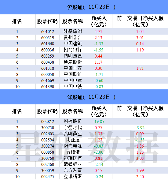 财联社11月23日电,北向资金今日净买入15.65亿元。隆基绿能、贵州茅台、以岭药业分别获净买入4.71亿元、2.13亿元、1.33亿元。恩捷股份净卖出额居首,金额为19.85亿元。