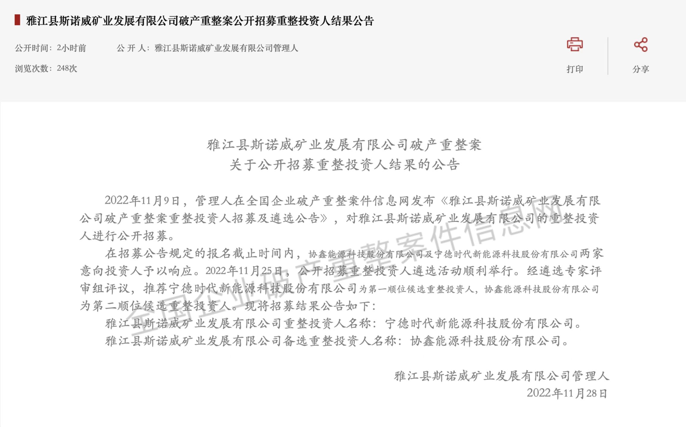听说持有德扯弄巴锂矿的斯诺威公司重整投资人有新进展,宁德时代截胡协鑫能科,能否求证一下?