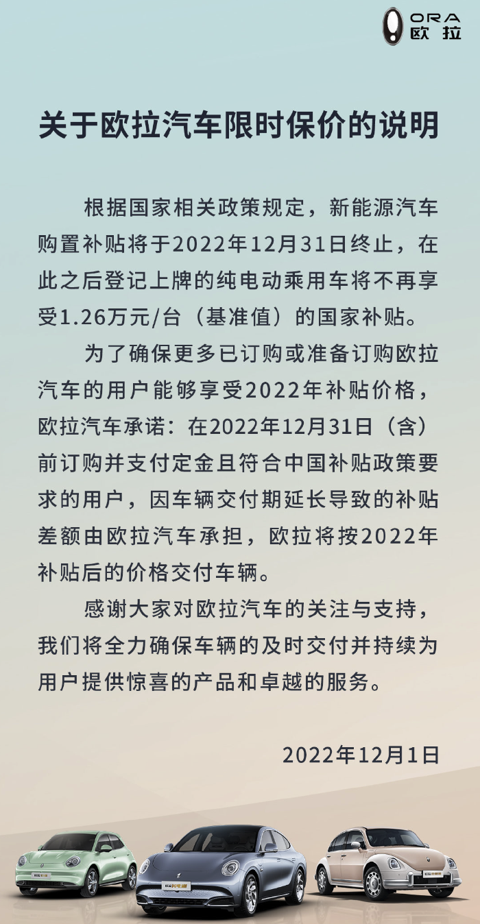 财联社12月1日电,欧拉汽车官博宣布推出限时保价政策:在2022年12月31日(含)前订购并支付定金且符合中国补贴政策要求的用户,因车辆交付期延长导致的补贴差额由欧拉汽车承担,欧拉将按2022年补贴后的价格交付车辆。