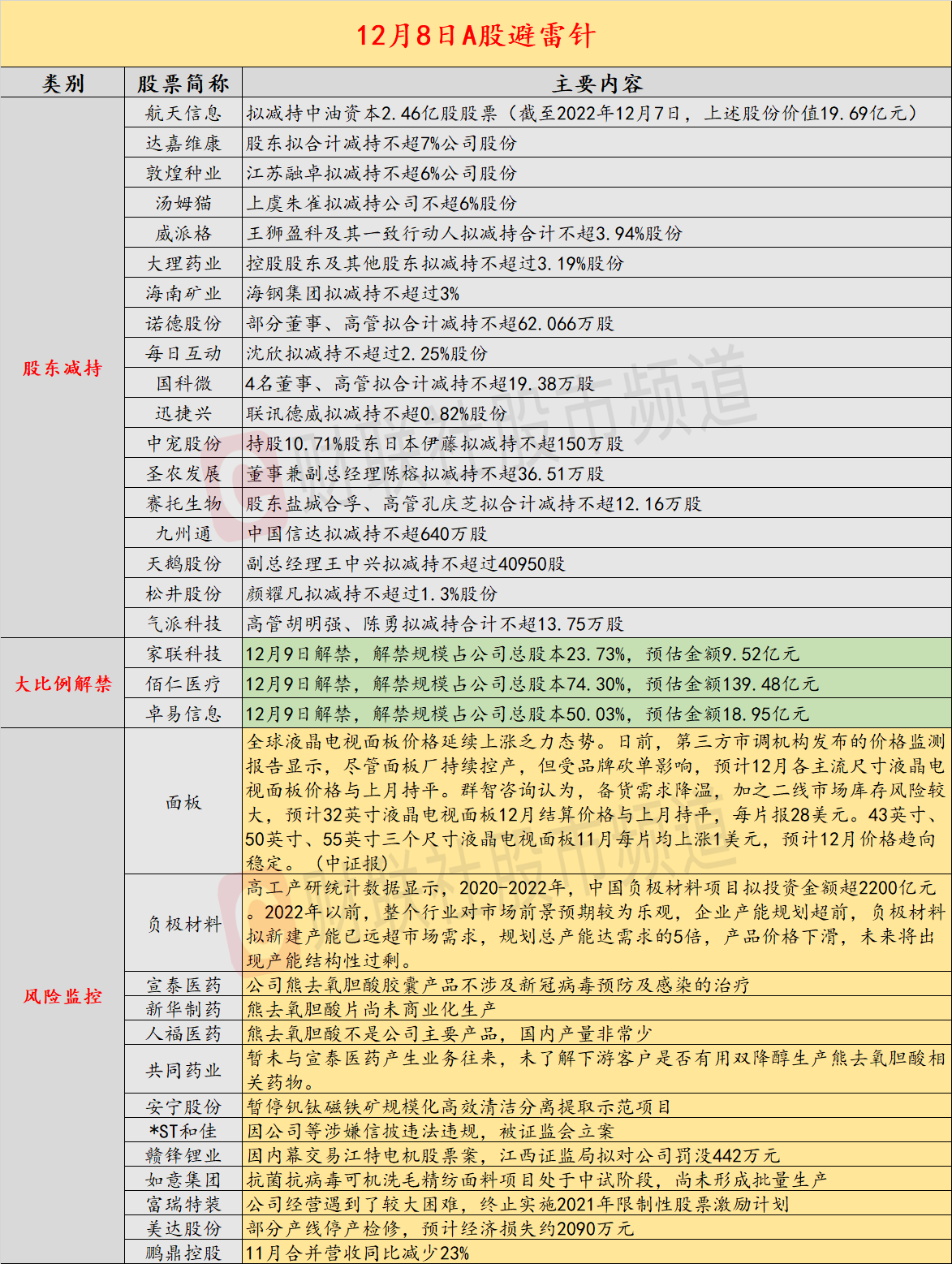 昨日A股拟减持规模较之前有所增多,航天信息拟减持中油资本2.46亿股股票,达嘉维康股东拟合计减持不超7%公司股份;佰仁医疗、卓易信息将迎来超五成以上解禁;今年已有超60家A股公司因涉嫌“蹭热点”“炒概念”被交易所关注或问询 ;宣泰医药熊去氧胆酸胶囊产品不涉及新冠病毒预防及感染的治疗;锂电负极材料市场规划总产能达需求5倍,产能将出现结构性过剩;新华制药熊去氧胆酸片尚未商业化生产;美股三大指数以下跌为主,大型科技股多数下跌。