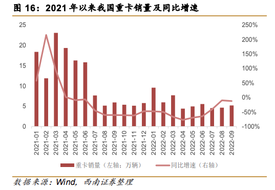 值得注意的是,据中国汽车工业协会数据显示,今年10月重卡销量同比下降35%。而来自第一商用车网的数据显示,11月重卡销量4.5万辆,同比降12%,环比降7%。其中疫情扰动成为四季度重卡销量持续低迷的主要因素。西南证券认为未来随着稳增长政策持续出台,重卡销量有望温和复苏。